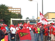 Zusätzlich zu den normalen Streikposten sammelten sich schon frühzeitig, vor 7.00 Uhr, viele Hunderte von Streikenden vor dem Werkstor. Kolleginnen und Kollegen aus etlichen anderen Werken und Betrieben Brandenburgs, Berlins, Sachsens, von ZF, von VW Mosel, EKO Stahl usw. waren zur aktiven Solidarität und Protest dazu gekommen. Sie alle bildeten das enge Spalier wütender Kollegen und Kolleginnen, durch das der Personalschef, der Vorstand und Wirtschaftsminister unter lautem Protest, Pfeifkonzerten, Buhrufen gegen den organisierten Streikbruch den Zug führen mußte - unter der Obhut der Polizei.