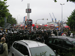 im Vorfeld angekündigten Leute Im Gegensatz zu dem Eindruck, den so viele sensationell aufgeblasene Berichte zu erwecken suchen, ist Rostock nicht im Straßenkampf versunken. Der gesamte Demozug durch die Stadt war normal verlaufen, Polizei war dabei, zumindest in der Innenstadt (Lange Straße usw.), nicht in Erscheinung getreten. Es wurden auch keinerlei Polizeikontrollstellen bemerkt, weder bei den Stadtzufahrten noch im Innenstadtbereich - wie dies sonst oft der Fall ist. Die Spitze der Demo dürfte ab ca. 14.30 Uhr auf dem Platz der Abschlußkundgebung im Stadthafen angekommen sein, als es schließlich in der Nähe dieses Platzes vermutlich gegen 15 Uhr zu Streß kam. Anscheinend dadurch kam der hintere Teil der Demo erst nach 16 Uhr zum Ziel. Diese erste Auseinandersetzung zwischen dem sog. Schwarzen Block und