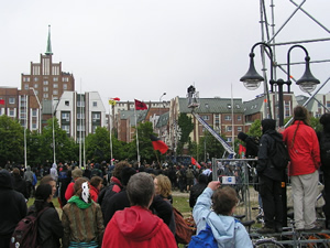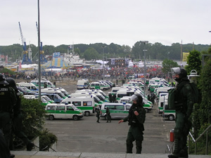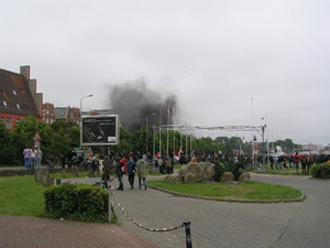 über viele Teilnehmer seitlich am Kundgebungsplatz entlang verteilt. Nach Medienberichten haben Autos gebrannt. Merkwürdig ist, daß dort überhaupt Autos parken durften, denn bei einer derartigen Großveranstaltung (und es wurden immerhin 100.000 Teilnehmer erwartet) würde man erwarten, daß dort Parkverbote herrschen und dennoch parkende Fahrzeuge rechtzeitig vor Veranstaltungsbeginn abgeschleppt werden. Nach Angabe eines Rostockers hatte man dort vor der Veranstaltung z.B. Papierkörbe und Müllcontainer weggeschafft. Gegen 17.50 gab es dann in der Lange Straße ein riesiges Polizeiaufgebot, das auf einen großen Einsatz schließen ließ. Auch 6 Wasserwerfer fuhren dort auf. Es gab danach anscheinend in der Straße Am Strande einen größeren Polizeieinsatz mit Beteiligung aller 6 Wasserwerfer, die um 19 Uhr immer noch dort mit blauem Blinklicht (gegenüber TV) postiert waren.