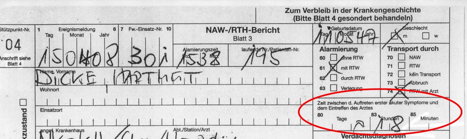 Die ganze Zeit hieß es, daß angeblich keinerlei Reaktionen von Hartmut dagewesen seien. Schon die Feuerwehr hatte das behauptet und auch in ihrem Bericht so vermerkt, obwohl ich ziemlich sicher bin, daß ich noch während der ersten Behandlung durch den Notarzt in Hartmuts Wohnung eine Art lautes Husten oder Ähnliches - so genau konnte ich das nicht identifizieren, weil ich ja vorher aus dem Zimmer gedrängt worden war - gehört hatte. Auch lautete es von Anfang an, ebenfalls als Begründung dafür, daß es eigentlich gar keine Hoffnung mehr gäbe: „Er hat ja schon 18 Stunden so gelegen“, was lediglich eine Vermutung ist, denn das konnte mit Sicherheit niemand behaupten. Es konnte ebenso erst kurz bevor ich kam, um 14 oder 15 Uhr passiert sein, das kann niemand sagen. Wie kommt der Notarzt dazu, etwas von 18 Stunden als feste Angabe in seinen schriftlichen Bericht dort hinein zu schreiben? (s. Fotokopie der entsprechenden Stelle)
